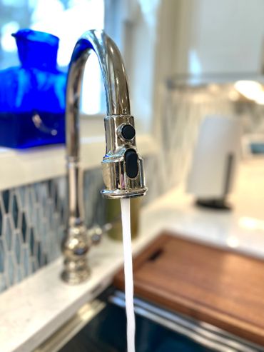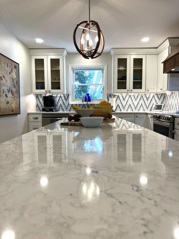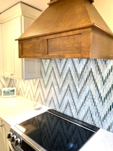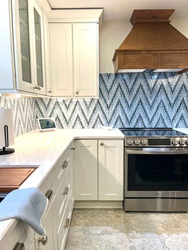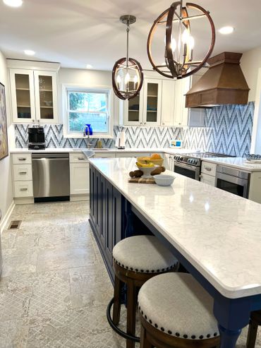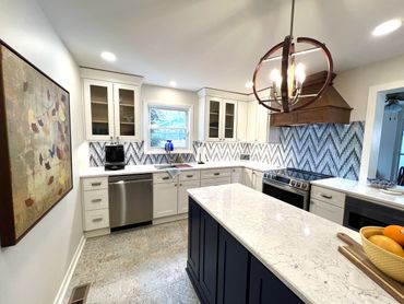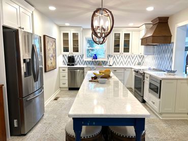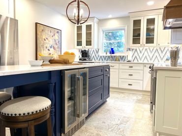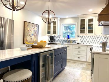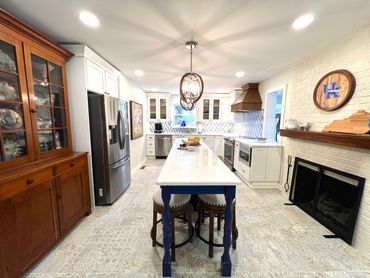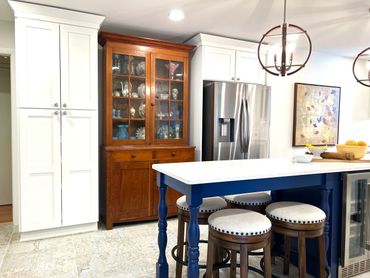 This project was a complete renovation of a space that confined the kitchen to the back with a small dining area adjacent. It was dark with soffits and cabinets hanging from the ceiling. The client specifically asked for a lighter, brighter, and larger kitchen with a splash of color and the incorporation of an antique Shaker cabinet. We couldn't be happier with the results!