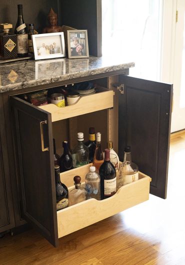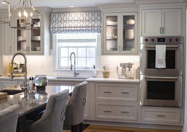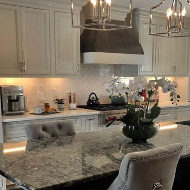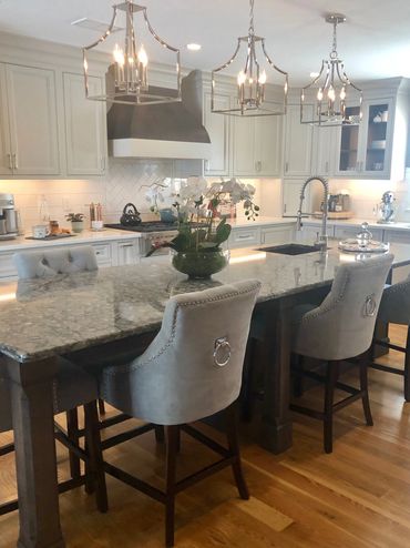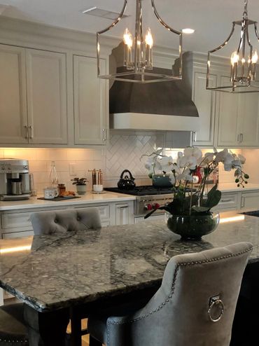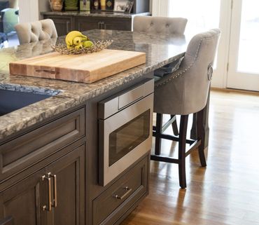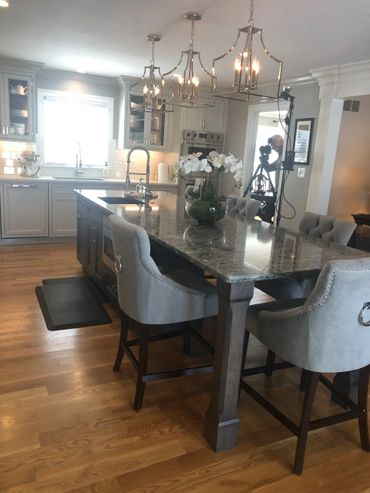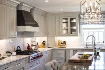 A luxurious kitchen has it all; high-end appliances, beautiful flooring, perfect lighting and custom cabinets and countertops. Nothing was spared in this design. All elements, from the dove grey cabinetry, stained wood hood, island and bar, and multitude of high end appliances, were specifically chosen with luxury in mind. Doubling the size of the original kitchen combined with all other components truly created the pinnacle of luxury.